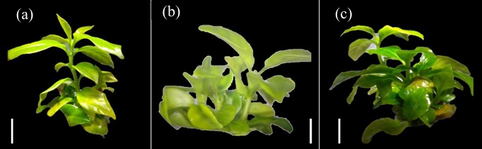 A los 45 días de cultivo, se observó la formación de brotes en los tratamientos suplementados con 3 y 6 mg L-1 de BAP. En concentración de 3 mg L-1 de BAP, los brotes se formaron de manera lateral a partir del tallo que estaba en contacto con el medio de cultivo (Figura 1b), mientras que en concentraciones de 6 mg L-1, se observó la formación de callo en la base de las yemas, a partir de la cual se generaron brotes que lograron desarrollarse (Figura 1c). En contraste, en el tratamiento control no se observó la formación de ninguna estructura en la base en contacto con el medio (Figura 1a). Este comportamiento es producto del efecto que tiene el BAP en los tejidos vegetales, ya que forma parte del grupo de reguladores de crecimiento vegetal del tipo citoquinina, las cuales son esenciales para controlar la respuesta a estímulos externos y son clave en numerosos procesos fisiológicos y de desarrollo (morfogénesis, organogénesis, formación de brotes) (Nehnevajova et al., 2019), así como, el correcto flujo del ciclo celular, promoviendo así la división celular (Schaller, Street y Kieber, 2014). Mientras tanto, a partir del reconocimiento de las citoquininas por parte de la célula, comienza una ruta de transducción de señales que desemboca en respuestas fisiológicas tales como la proliferación de brotes y raíces, generación de cúmulos de células indiferenciadas y diferenciación celular (Müller y Sheen, 2007; Zürcher and Müller, 2016; Jameson y Song, 2020).