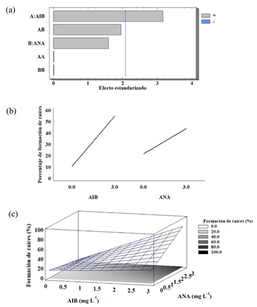 Figura 3: Gráficos estadísticos generados por el diseño experimental de superficie de respuesta para evaluar el efecto de ANA y AIB sobre la rizogénesis in vitro en plantas mutagenizadas de Coffea arabica. (a) Gráfica de Pareto estandarizada del efecto del AIB y ANA; (b) Gráfico de efectos principales de AIB y ANA sobre el porcentaje de formación de raíces; (c) Gráfico de superficie de respuesta estimada del efecto relativo de AIB y ANA sobre el porcentaje de formación de raíces.