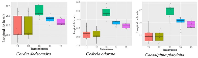 Por otro lado, en cuanto a la presencia de HMA, se observó un impacto positivo en el crecimiento de la longitud radicular de las plántulas de Chakté-viga, cedro rojo y ciricote de las especies SAF. Según el análisis de varianza de un factor, se detectaron diferencias significativas entre los tratamientos evaluados. En la sexta semana, los tratamientos T3, T4 y T5 registraron valores promedio de longitud radicular de 19.4 cm, 24.0 cm y 26.0 cm, respectivamente, los cuales fueron superiores a los valores obtenidos en los tratamientos sin inoculantes (Control) T1 y T2, que no superaron los 21.9 cm (Figura 5). Estos resultados son consistentes con los reportados por Gimabel-Tamara (20224). Los resultados de esta investigación confirman que los beneficios de los HMA, demostrando su éxito en cultivos a campo abierto, así como en sistemas de cultivo en medios enriquecidos in vitro, aportando significativamente resultados exitosos en distintos tipos de cultivo, como promotoras del crecimiento (Alarcón, Cerrato, Chávez y Monter, 2000).