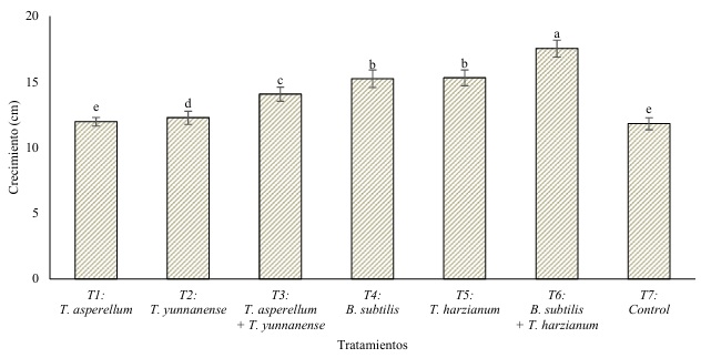 El impacto positivo de la aplicación combinada de B. subtilis + T. harzianum sugiere que la combinación específica de microorganismos, B. subtilis + T. harzianum, generó un efecto sinérgico que favoreció el desarrollo de las plántulas (Elnahal et al., 2022; Kredics et al., 2024). El incremento en el crecimiento de plantas de banano con la presencia de Trichoderma spp. y Bacillus spp. se puede atribuir a varios factores principales, según Etesami, Ryoung y Glick (2023) estos microorganismos favorecen la absorción de nutrientes al liberar enzimas como quitinasa, glucanasa, proteasa y celulasaque descomponen moléculas de nutrientes en formas más solubles para la planta. Además, de acuerdo a Zaheer et al. (2019), promueven la salud radicular al producir sustancias antimicrobianas que protegen las raíces de enfermedades (Jabborova et al., 2024; Ramírez-Pool, Calderón, Ruiz, Ortiz y Xoconostle, 2024). Zhao et al. (2015), agregan que otro de sus efectos es que desencadenan respuestas hormonales positivas al generar fitohormonas como ácido abscísico, auxinas, giberelinas, entre otras que estimulan el crecimiento (Giordano et al., 2023; Van Hee et al., 2023) y desarrollo de las plantas (Galeano et al., 2024).