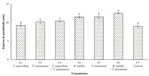 En cuanto al diámetro de pseudotallo, se observó que las plantas tratadas con T6 mostraron un mayor diámetro (43.87 mm) con relación a los otros tratamientos y control (39.83 mm), como se muestra en el (Cuadro 3). El incremento de esta variable (engrose de pseudotallo) entre las semanas 16 y 20 fue de 12.50 mm desde en el T6, seguido de 11.53 mm en el T5 con aplicación de T. harzianum y 11.47 mm de las plantas tratadas con B. subtilis, estadísticamente diferentes del control sin aplicación con 8.97 mm (Figura 2). En estas variables las cepas nativas de Trichoderma (T. asperellum y T. yunnanense) no lograron incrementar el desarrollo de las plántulas, llegando incluso a alcanzar valores similares a los registrados en el control, como es el caso de T. asperellum.Ghasemi, Esmaeili y Mohammadi (2022) y Santana, Vera y Vélez (20231), sostienen que esto podría atribuirse a la capacidad de los microorganismos para fortalecer las paredes celulares o inducir procesos fisiológicos que promueven un desarrollo más robusto de las estructuras del pseudotallo (Hao et al., 2022). La aplicación de microorganismos que mejoran el desarrollo de las plantas, tanto estructural como sanitariamente puede tener consecuencias positivas futuras a nivel de rendimiento o cosecha (Lamichhane, Corrales y Soltani, 2022; Reyes, León y Barrezueta, 2023; Seekham, Kaewsalong, Jantasorn y Dethoup, 2024).