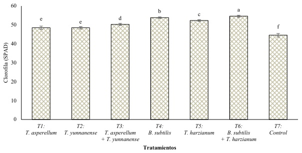 En cuanto a la síntesis y retención de clorofila en las hojas de las plántulas de banano, es posible que tanto B. subtilis como Trichoderma spp. estén activando procesos bioquímicos que mejoran la eficiencia fotosintética (Alfiky y Weisskopf, 2021). Estos microorganismos, según describen Bononi, Chiaramonte, Pnasa, Moitinho y Melo (2020), son conocidos por sus propiedades promotoras del crecimiento y su capacidad para estimular respuestas hormonales en las plantas. Según Castillo, Piug y Cumagun (2019), los microorganismos estudiados pueden llegar a incrementar la producción de clorofila al mejorar la disponibilidad de nutrientes y agua, elementos esenciales para la fotosíntesis (Sánchez et al., 2018; Khatun, Joya, Hoque y Monjil, 2021).