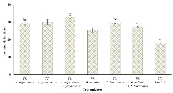 Figura 4: Longitud de la raíz en plántulas de banano durante el tiempo de estudio en respuesta a la aplicación de fertilización biológica. Promedios con la misma letra no difieren estadísticamente según la prueba de Tukey (P ≤ 0.05). Barras de error representan la desviación estándar en cada tratamiento.
