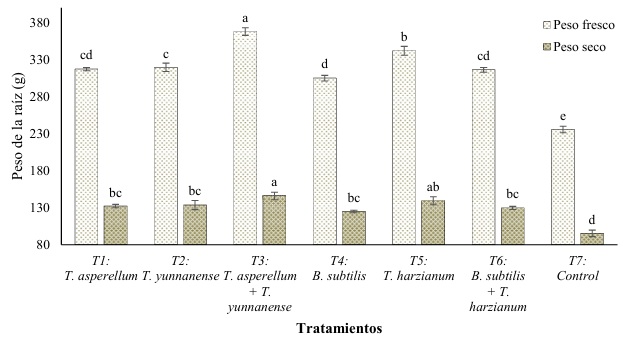 El desarrollo radicular de las plantas tratadas en comparación con las no tratadas (control) fue significativamente superior en todos los tratamientos con los microorganismos benéficos (Figura 4). La mayor longitud de raíces se registró en las plantas tratadas con la combinación de las cepas nativas de T3 con un promedio de 32.93 cm, seguidas del T2 con aplicación de T. yunnanense (30.13 cm). Por su parte, el control registró los valores más bajos con 18.10 cm. Con la aplicación de T3 se presentó mayor peso fresco y seco radicular con 367.93 y 145.84 g, respectivamente (Figura 5). Dichos valores fueron significativamente diferentes de los demás tratamientos quienes registraron pesos húmedos que oscilaron entre 235.53 y 342.03 gramos.