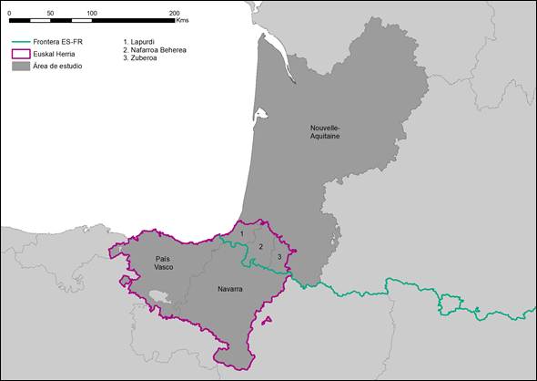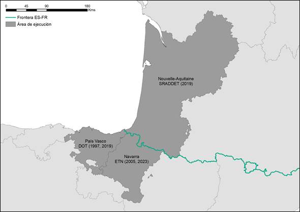 Dicho esto, la presente investigación busca dirimir el tratamiento del carácter transfronterizo en las figuras de ordenación territorial del área de estudio, conformada en una escala de conjunto por la Comunidad Autónoma del País Vasco (CAPV), la Comunidad Foral de Navarra y la région francesa de Nouvelle-Aquitaine. Así, se investiga de qué forma se establece la cuestión transfronteriza en sus documentos de ordenación, abordando tres escalas de análisis: planificación territorial a escala NUTS 2,1 a escala intermedia y planeamiento urbanístico. Para ello, se estudia cada uno de los apartados clásicos de todo documento de planificación: análisis, diagnóstico y prognosis (Pujadas & Font, 1998).
