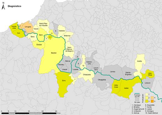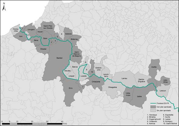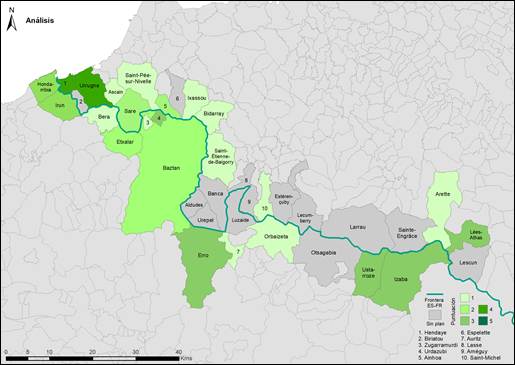 De los 24 documentos de planeamiento urbanístico analizados en esta investigación, cabe señalar, de entrada, que 11 de ellos ignoran de facto el hecho fronterizo. Si bien alguno de ellos menciona puntualmente la presencia de la frontera, como se da en los casos del PLU de Saint-Étienne-de-Baïgorry o en el Plan General de Urbanismo (PGU) de Auritz, esta carece de relevancia, tanto en sus apartados analíticos como propositivos. Se encontró con planes basados en la regulación de los usos del suelo del término municipal, sin establecer consideraciones en clave fronteriza.