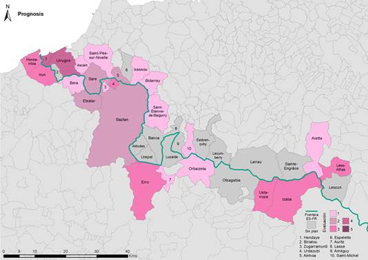 No obstante, la prognosis no es coherente con estos diagnósticos. En efecto, a excepción del PTP de Donostialdea-Bajo Bidasoa ―en el que se formula la construcción de una red de ferrocarril que conecte con la red de alta velocidad francesa (Gobierno Vasco, 2016)―, se plantean directrices genéricas, basadas en “fomentar” o “priorizar” determinadas orientaciones hacia lo transfronterizo, en sectores como el de la movilidad (Gobierno de Navarra, 2011a; Syndicat d’Études pour l’Élaboration du SCOT Sud Pays Basque, 2005) o la gestión de espacios naturales y recursos hídricos (Gobierno de Navarra, 2011a, 2011b).