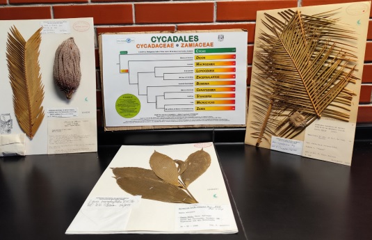 Figura 2: Versión en español del póster “Filogenia de Cycadales” (Cole y Calvillo-Canadell) con tres ejemplares de herbario (Dioon califanoi De Luca & Sabato, Dioon edule Lindl., Zamia skinneri Warsz.) en el Herbario Nacional de México (MEXU). Fotografía: Laura Calvillo-Canadell.