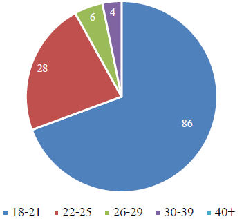 A continuación, se presenta el perfil académico de 127 estudiantes que participaron en las primeras dos ediciones del modelo, las cuales se realizaron en 2021 y 2022. En la gráfica 1 se muestra que la edad promedio de 85 alumnos participantes oscilaba entre 18 y 21 años (67 %), seguido por 28 estudiantes dentro del rango de 22 a 25 años (22 %). También se contó con la participación de 14 estudiantes mayores de 26 años, pero en menor medida (11 %).