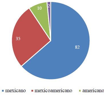 En la gráfica 2 se puede apreciar que 82 estudiantes (65 %) se identificaron como mexicanos, 34 como mexicoamericanos (27 %), 9 como americanos (7 %) y 2 se reportaron como “otro” (1 %) (uno era español-americano y el otro panameño).6
