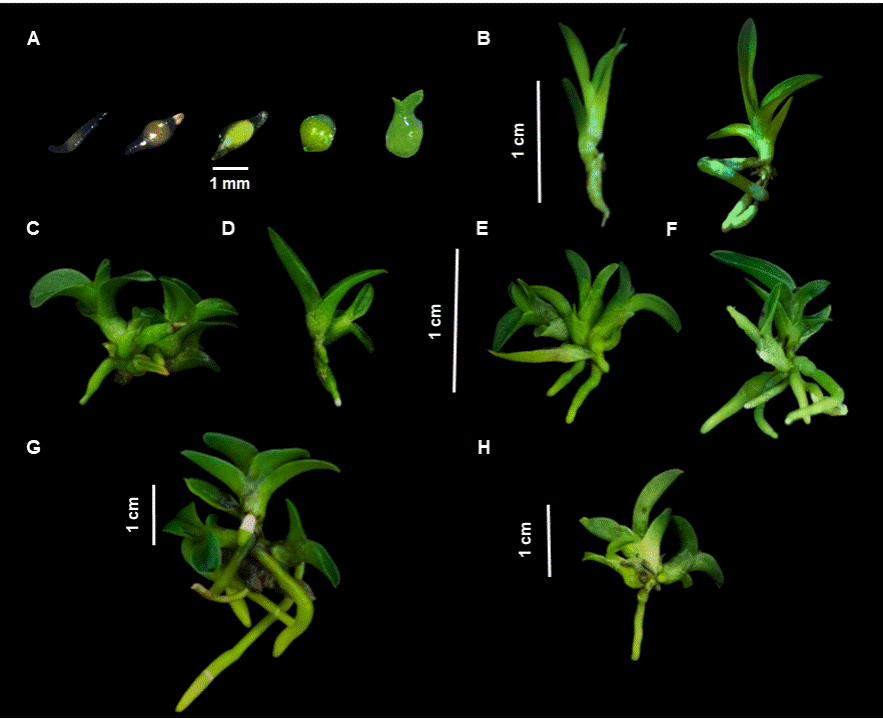 El tiempo requerido para la germinación de semillas de orquídeas es variable entre las especies. En este estudio se obtuvieron plántulas de R. glauca de 2 cm de longitud con tres a cuatro hojas y raíces a las 25 semanas después de la siembra (Figura 1B). Por otra parte, se ha reportado que para Dendrobium strebloceras se logró el desarrollo de plántulas a las 24 semanas de siembra (Diantina et al., 2020) y para Sedirea japonica se logró el desarrollo de plántulas a las 28 semanas después de la siembra (An et al., 2021).