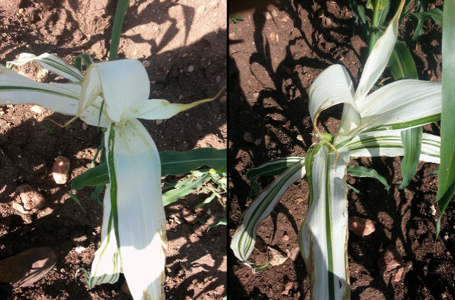 Figure 1 Maize plants (Zea mays ) showing symptoms of dwarfism, stunting and white leaves with green stripes and brown edges associated with phytoplasma infection.