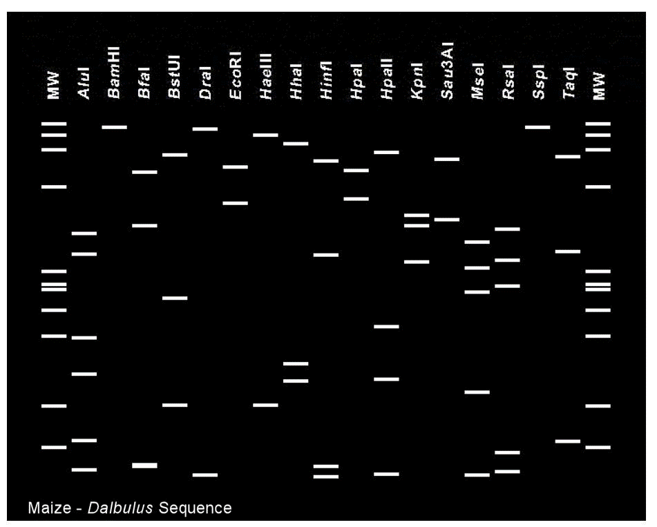 Figure 2 Virtual restriction fragment length polymorphism (RFLP) patterns derived from in silico digestions of 16S rDNA gene fragment from Maize/Dalbulus phytoplasma sequence. Image of virtual gel of RFLP patterns of Maize/Dalbulus phytoplasma sequence with recognition sites for the following 17 restriction enzymes for simulated digestions: AluI, BamHI, BfaI, BstUI, DraI, EcoRI, HaeIII, HhaI, HinfI, HpaI, HpaII, KpnI, Sau3AI, MseI, RsaI, SspI and TaqI. MW: molecular weight standards from ɸX174 DNA digested with HaeIII.