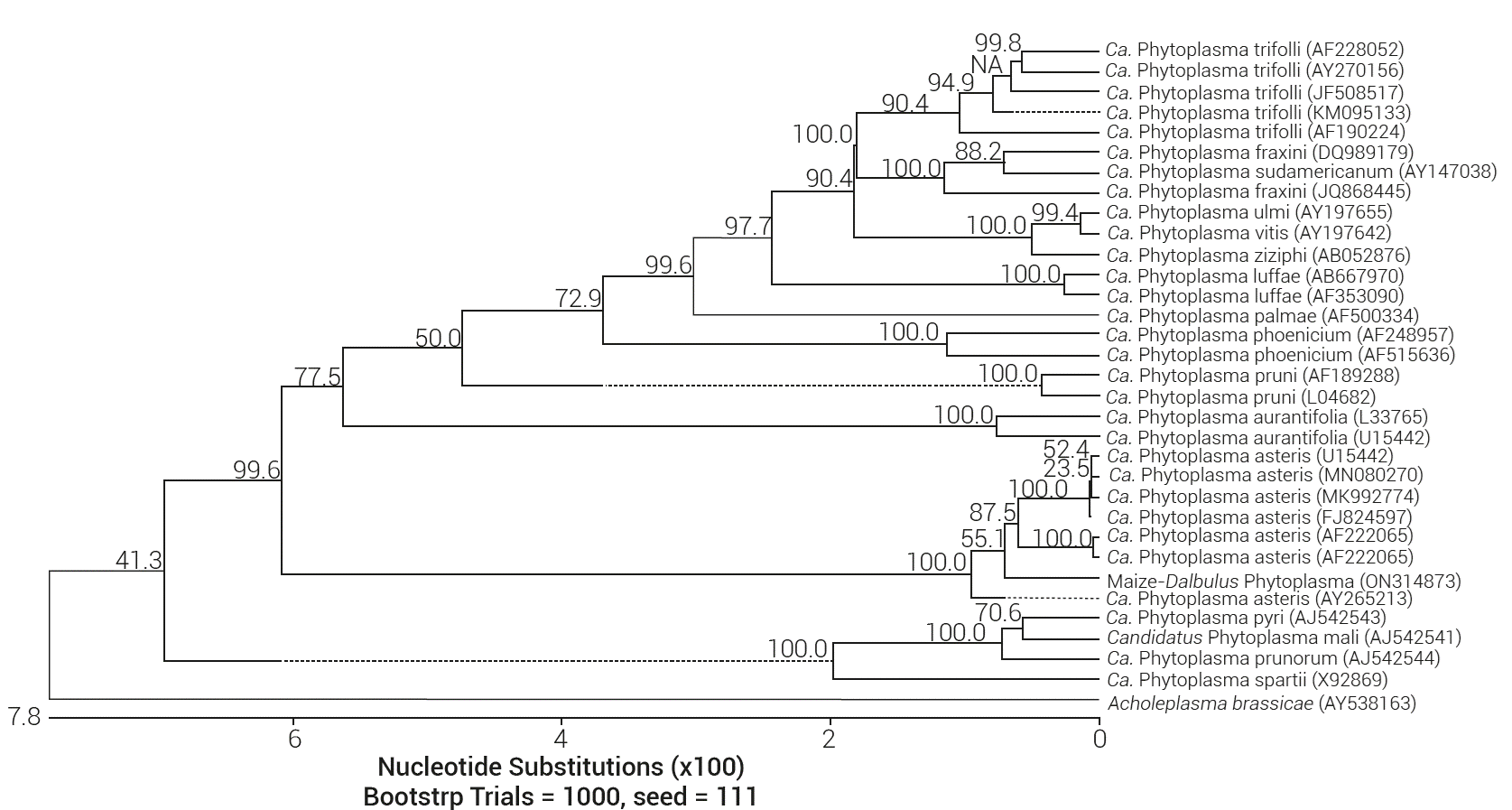Typical phytoplasma DNA amplicons of 1227 bp were obtained by nested PCR using total DNA extract from the Dalbullus maidis mixture and, at the same time, in 14 out of 15 symptomatic DNA samples from maize plants. No amplification was observed in asymptomatic maize plants. BLAST analysis of the 16S rDNA sequences revealed that Phytoplasma from Dalbulus maidis and symptomatic maize plants shared 100 % sequence identity with each other and 99.7 % sequence identity with those in group 16SrI, strains of Candidatus Phytoplasma asteris. The Maize/ Dalbulus phytoplasma sequence (GenBank ON314873) was compared with those in the Iphyclassifier database (http://plantpathology.ba.ars.usda.gov/cgi-bin/resource/iphyclassifier.cgi), and the maximum identity was found with isolates of Candidatus Phytoplasma asteris.