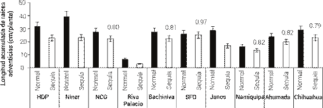 Figura 1 Longitud acumulada de raíces adventicias de 10 poblaciones de pasto banderita (Bouteloua curtipendula) en dos condiciones de humedad, simuladas a través de dos patrones de precipitación pluvial de verano más comunes en el estado de Chihuahua, México(Esqueda et al., 2005). Los números arriba de las barras representan la proporción de la condición de sequía con respecto a la condición normal de humedad. Los asteriscos indican diferencias significativas entre tratamientos de humedad (P ≤ 0.05). HDP: Hidalgo del Parral, NCG: Nuevo Casas Grandes, SFO: San Francisco del Oro. Las líneas verticales representan ± el error estándar de la media.