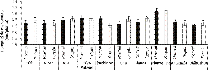 Figura 2 Longitud de mesocótilo de 10 poblaciones de pasto banderita (Bouteloua curtipendula) en dos condiciones de humedad simuladas a través de dos patrones de precipitación pluvial de verano comunes en el estado de Chihuahua, México(Esqueda et al., 2005). HDP: Hidalgo del Parral, NCG: Nuevo Casas Grandes, SFO: San Francisco del Oro. Las líneas verticales representan ± el error estándar de la media.
