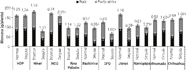 Figura 3 Producción de biomasa radical y de parte aérea de 10 poblaciones de pasto banderita (Bouteloua curtipendula) en dos condiciones de humedad simuladas a través de dos patrones de precipitación pluvial de verano comunes en el estado de Chihuahua, México(Esqueda et al., 2005). Los números arriba de las barras representan el coeficiente raíz/ parte aérea, para cada una de las condiciones (normal y sequía). Los asteriscos indican diferencias significativas entre tratamientos de humedad (ANOVA, P ≤ 0.05). HDP: Hidalgo del Parral, NCG: Nuevo Casas Grandes, SFO: San Francisco del Oro. Las líneas verticales representan ± el error estándar de la media.