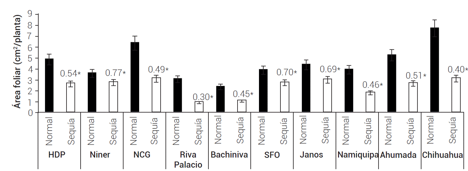 Figura 4 Área foliar de 10 poblaciones de pasto banderita (Bouteloua curtipendula) en dos condiciones de humedad simuladas a través de dos patrones de precipitación pluvial de verano comunes en el estado de Chihuahua, México(Esqueda et al., 2005). Los números arriba de las barras representan la proporción de la condición de sequía con respecto a la condición normal de humedad. Los asteriscos indican diferencias significativas entre tratamientos de humedad (ANDEVA, P ≤ 0.05). HDP: Hidalgo del Parral, NCG: Nuevo Casas Grandes, SFO: San Francisco del Oro. Las líneas verticales representan ± el error estándar de la media.