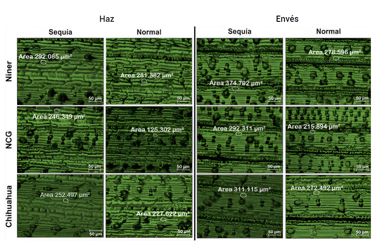 Las variables DE y AE también presentaron una respuesta variable al estrés por sequía. La mayoría de las poblaciones presentaron una disminución (P ≤ 0.05) en la DE del haz cuando fueron sometidos a condiciones de sequía. En el envés, cinco poblaciones presentaron un incremento (P ≤ 0.05), dos una disminución (P ≤ 0.05) y tres no mostraron cambios (P > 0.05) en DE cuando estuvieron en sequía. Por otro lado, el AE de la mayoría de las poblaciones mostró un incremento (P ≤ 0.05) de entre 8 y 53% en la condición de sequía, tanto en el haz como en el envés (Cuadro 3), lo que concuerda con Hong et al. (2018), quienes observaron que las plantas pueden modificar su densidad estomática como medida adaptativa a las condiciones ambientales.