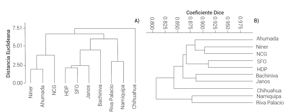 Figura 6 Dendrogramas de agrupamiento de 10 poblaciones de pasto banderita (Bouteloua curtipendula). A) Elaborado con la información de 10 variables fenotípicas evaluadas en condiciones de sequía simulada y método de ligamento Ward. B) Elaborado con la información de 186 fragmentos de AFLPs y el método de agrupamiento UPGMA.