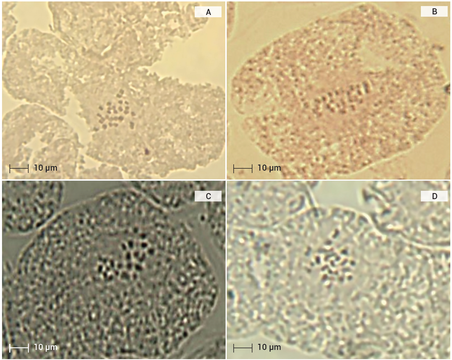Figura 1 Observaciones citológicas en zarzamora (Rubus spp.) variedad Kiowa propagada en forma sexual (A y B), conteo de cromosomas 4x = 28; y propagada en forma asexual (C y D), conteo de cromosomas 3x = 21, escala 10 µm.