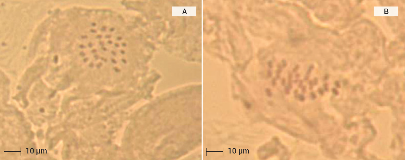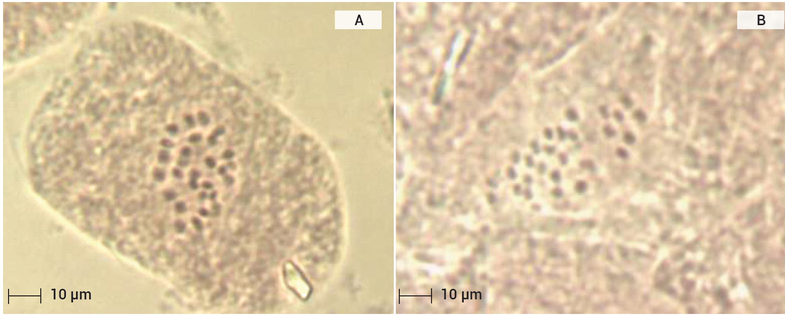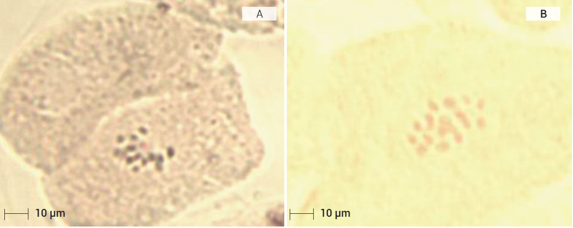 Figura 6 Observaciones citológicas en zarzamora (Rubus spp.) variedad Ébano propagada en forma asexual (A y B). Conteo de cromosomas 4x = 28. Escala 10 µm.