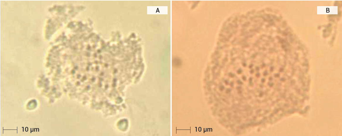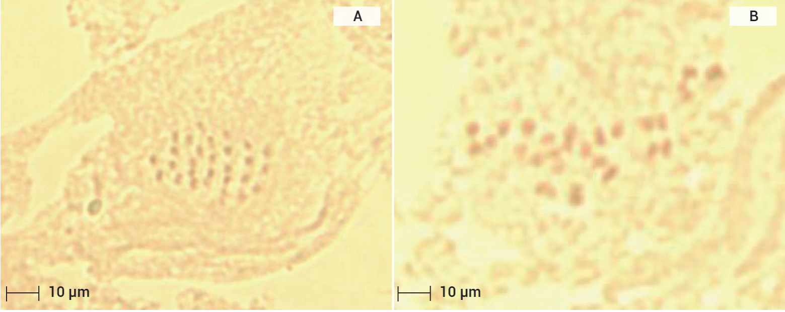 Figura 7 Observaciones citológicas en zarzamora (Rubus spp.) población de Teziutlán propagada en forma sexual (A y B). Conteo de cromosomas 2x = 14. Escala 10 µm.