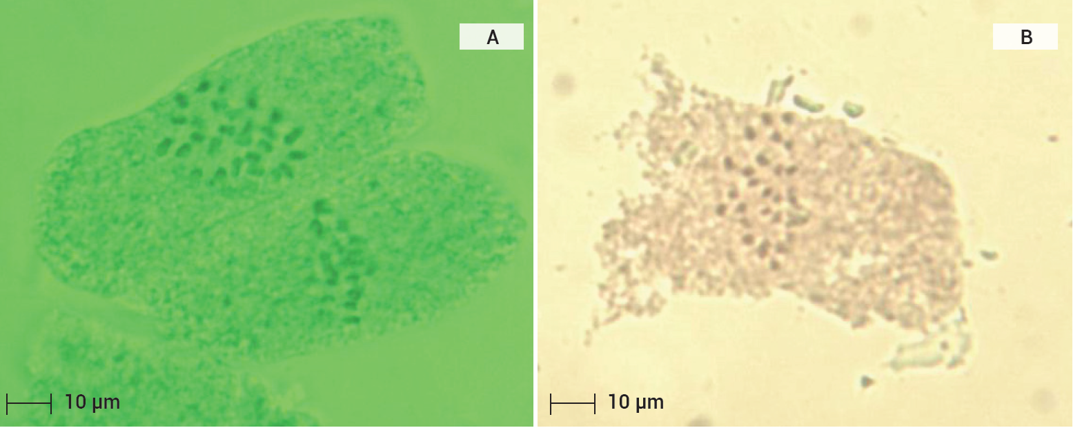 Figura 4 Observaciones citológicas en zarzamora (Rubus spp.) variedad Cheyenne propagada en forma asexual (A y B). Conteo de cromosomas 4x = 28. Escala 10 µm.