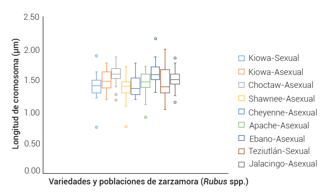 La prueba de comparación de medias Tukey (P ≤ 0.05) (Cuadro 3) indicó que hubo diferencias significativas en longitud de cromosomas entre las variedades o recolectas reproducidas asexualmente; por el contrario, entre las variedades reproducidas por semilla (Teziutlán y Kiowa) no hubo diferencias. Estos resultados muestran indicios de que la propagación asexual tiene mayor relación con la inestabilidad cromosómica, en comparación con la reproducción sexual, lo cual coincide con lo señalado por Vallejo-Marín (2014).