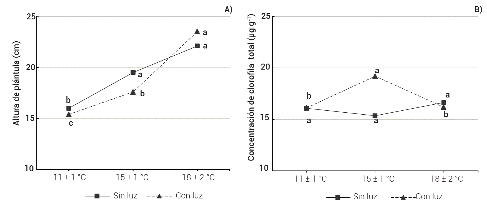 En cuanto al contenido de clorofila total, no hubo cambio alguno por efecto de la luz suplementaria y tampoco fue modificado por la temperatura nocturna aplicada en las plántulas (Cuadro 2). El análisis de varianza indicó efectos significativos para la interacción luz × temperatura nocturna respecto a altura de plántula y clorofila total (Figura 1). La interacción para altura de plántula se explica porque con luz suplementaria y mayor temperatura, las plántulas incrementan su altura en mayor proporción que las plántulas sin luz a la misma temperatura, probablemente por síntesis de más auxinas o giberelinas que intervienen en la elongación celular (Wien, 2020), o porque la combinación de luz suplementaria y temperatura nocturna más alta provocaron un metabolismo más acelerado reflejado en una tasa de producción y uso de asimilados más rápida que favoreció un mayor crecimiento (Taiz et al., 2018). La interacción significativa para la concentración de clorofila total se debe a que cuando las plántulas fueron manejadas a 15 °C durante la noche, con luz suplementaria se incrementó la concentración de clorofila total respecto al tratamiento con luz a 11 ºC; sin embargo, al aumentar la temperatura a 18 °C con luz suplementaria, se redujo la concentración de clorofila, mientras que sin luz led suplementaria la concentración fue casi constante bajo cualquier nivel de temperatura evaluado.
