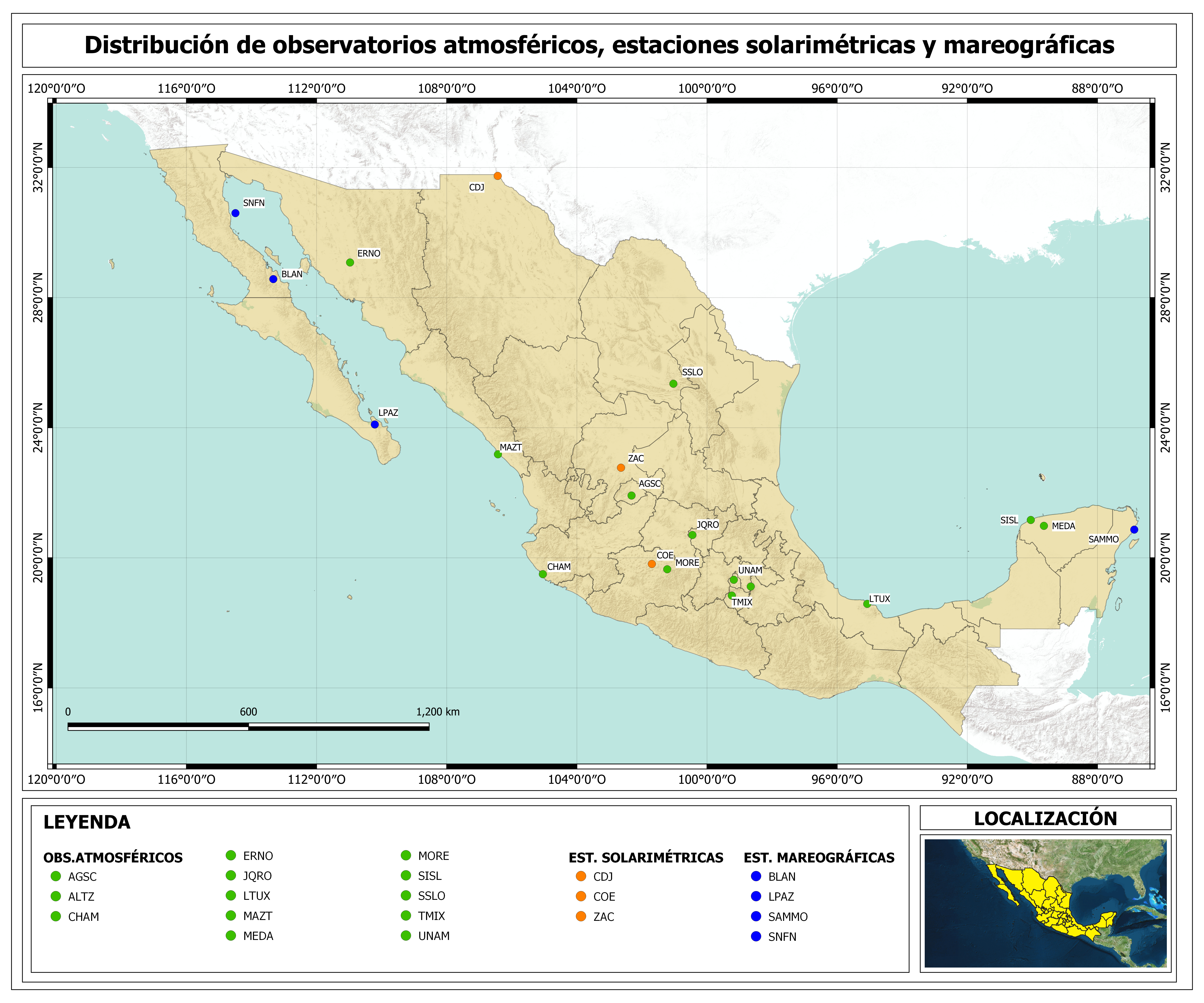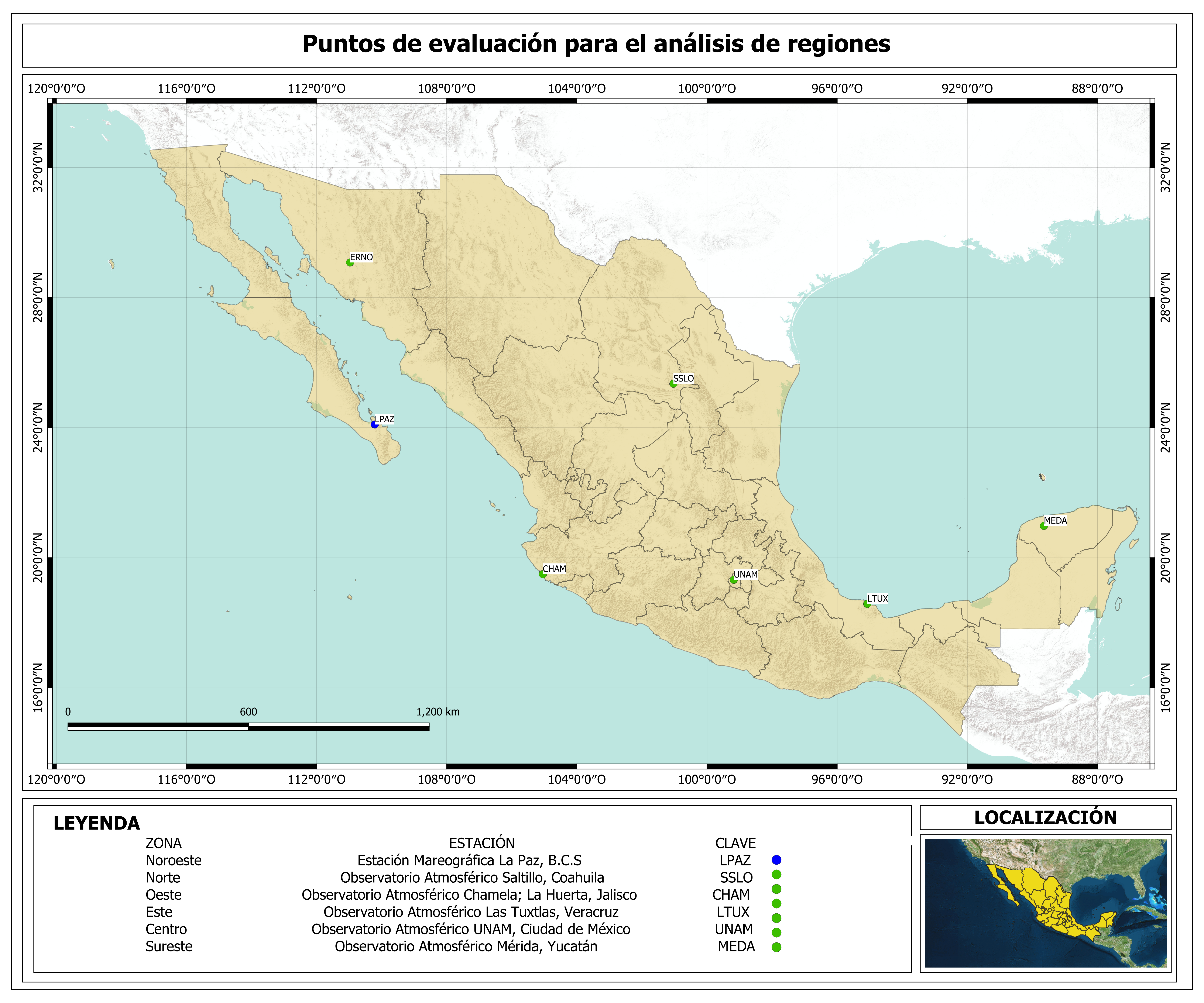 Con el fin de evaluar la variación de un parámetro meteorológico en términos de su distribución espaciotemporal, y de acuerdo con Diaz-Félix (2012), se sugiere dividir en subregiones o subperíodos de tiempo (meses o estaciones del año). Ya que, se presentan diferencias considerables entre los diversos tipos de clima y la orografía del país. Estos factores, como ya se mencionó, afectan la distribución de la irradiancia, a la par, se deben reflejar en las estimaciones suministradas por las bases de datos. A fin de generar un desarrollo más amplio, se seleccionaron siete de los 20 sitios sometidos a esta evaluación para cada zona principal del país. En la Figura II se ilustra la distribución geográfica de la estación mareográfica y los seis observatorios atmosféricos.