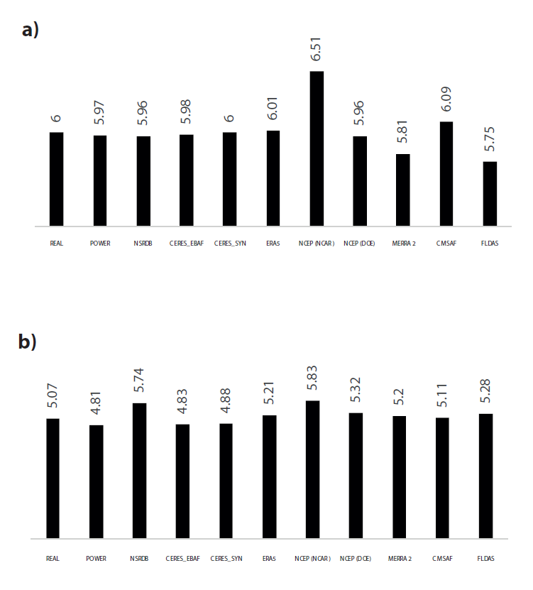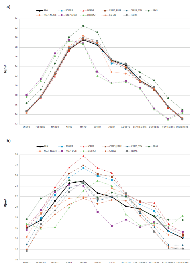 Por un lado, POWER es un sitio web con una interfaz amigable que, a través de un mapa interactivo de respuesta rápida le permite al usuario descargar, en diferentes formatos, las estimaciones de irradiancia global, directa, difusa, entre otros. Se encuentra en constante mantenimiento al ser una base compuesta por varios modelos y datos de sistemas de percepción remota pertenecientes a la NASA. Cuenta con una resolución espacial de 0.5°× 0.5° (celda de 55.56 × 55.56 km). Aunque subestima ligeramente las estimaciones de irradiancia e irradiación, consiguió correlaciones fuertes (0.66 a 0.99) y generó del 1.7 % al 15.15 % de error absoluto para irradiancia y 0.8 % a 12.35 % para irradiación. Además, mostró mayor adaptabilidad espacial en el análisis por regiones.