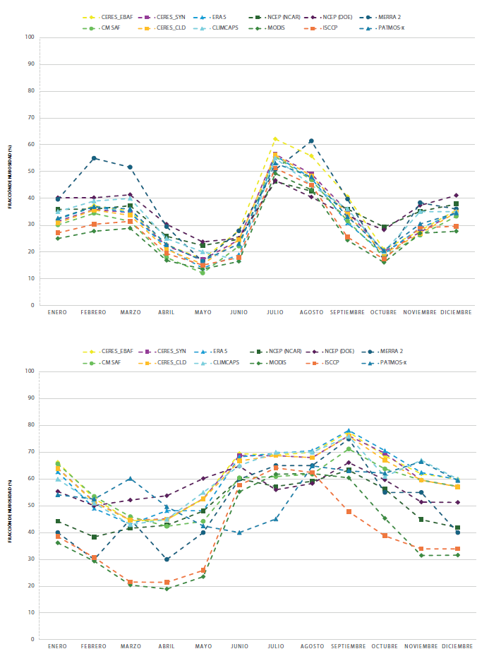 Las doce bases que estiman el porcentaje de fracción total de nubosidad se compararon entre sí, replicando el comportamiento atmosférico exitosamente. Cabe destacar que, a falta de observaciones es difícil determinar concretamente los porcentajes de nubosidad. A pesar de ello, se destacan aquellos productos que tenían un nivel superior de resolución espaciotemporal para generar porcentajes con mayor exactitud. Tales como CERES_CLD, MODIS y PATMOS- x.