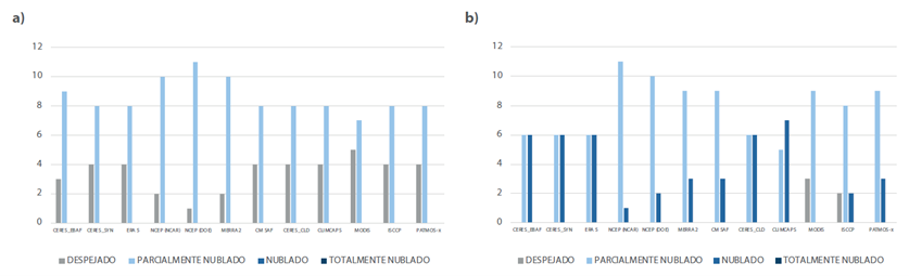 Para el caso del área total de nubosidad, MODIS fue de los resultados más similares para estimarla, en especial, en las zonas norte y noroeste. PATMOS-x implementó conjuntos definidos que incluyen parámetros más específicos de la cobertura nubosa del cielo, mostrando mayor definición temporal y espacial para cada punto. CERES_CLD es de los datos de nubosidad más precisos, al destacar que fueron similares a los productos de CERES_EBAF, CERES_SYN, ERA5, CM SAF y CLIMCAPS. Por último, ISCCP modeló el factor de nubosidad en promedio parcialmente aceptable, obteniendo un comportamiento subestimado a comparación de otras bases.