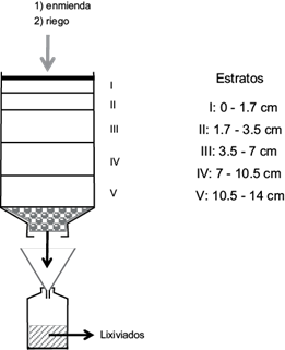 Al finalizar el ensayo, las columnas de suelo se dejaron secar a temperatura ambiente. Posteriormente se desempacó el suelo de las columnas, dividiéndolo en cinco estratos: 0-1.7 cm (I), 1.7-3.5 cm (II), 3.5-7 cm (III), 7-10.5 cm (IV) y 10.5-14 cm (V).