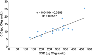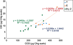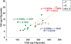 Por otro lado, se observó una relación entre COD y CID. Como se mencionó más arriba, existe una interconversión entre COD y CID en los suelos. En la figura 4 se presenta la relación entre el COD y el CID en todos los tratamientos (T, E. B y Z) y en todos los estratos (I, II, III, IV, V). La correlación mejora al tener en cuenta los tratamientos por separado (Fig. 5).
