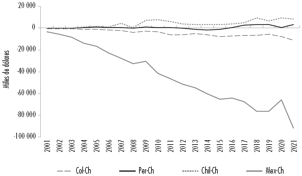 En contraste, al analizar la balanza comercial de cada país por separado se aprecia que la situación de México y Colombia es diferente a la de Chile y Perú. Los primeros muestran un déficit permanente y creciente, mientras que Chile y Perú han mantenido un superávit que tiende a incrementarse. Según García-Parra (2018), la existencia de estos dos bloques explica por qué tras la conformación de la AP es difícil adelantar un plan de acción conjunto, pues mientras un bloque percibe a China como un agente desestabilizador de la industria nacional, el otro busca consolidar procesos de integración comercial (véase Figura 2).
