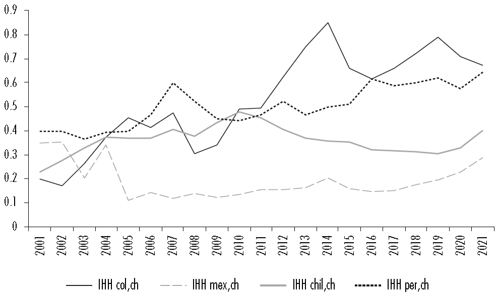 La literatura sobre la estimación del IHH entre Latinoamérica y China es extensa y evidencia variaciones según el país de análisis (Cunha et al., 2013; Kacef, 2016; Rosales y Herreros, 2017; Manting, 2021). Paredes (2017) destaca la alta concentración del comercio intrarregional donde China destaca por su diversidad interna de mercados fortaleciendo sus industrias y posición como economía dominante. Sin embargo, en América Latina el comercio intrarregional muestra una concentración más alta y la mayoría de las importaciones superan a las exportaciones.
