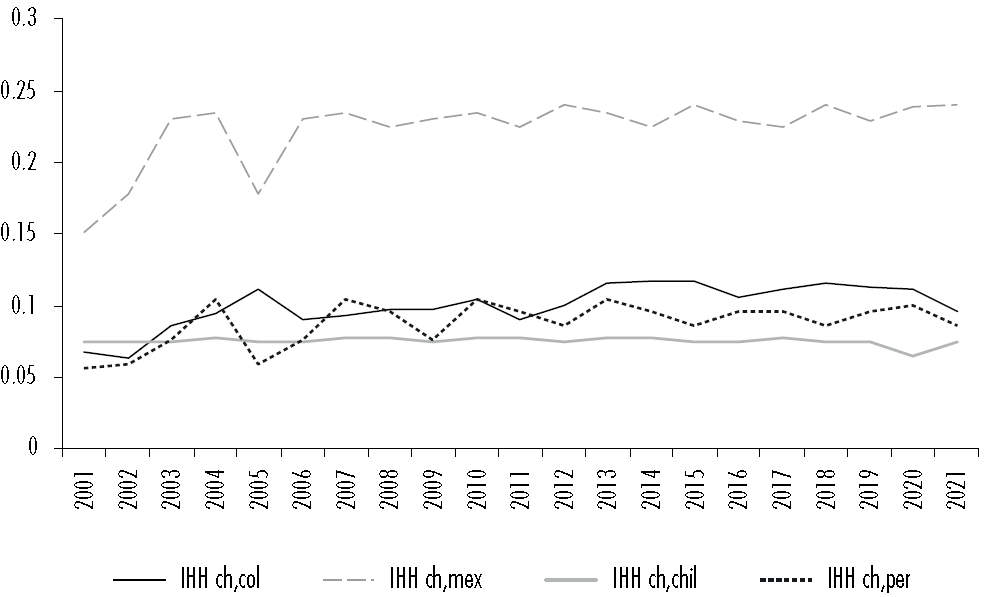 Frente al IHH de cada país de la AP con respecto a China, se identifica que las exportaciones de los primeros, con excepción de México, se encuentran bastante concentradas. Adicionalmente, en el periodo analizado, esta tendencia se ha acentuado para todos los países excepto Chile (véase Figura 3).