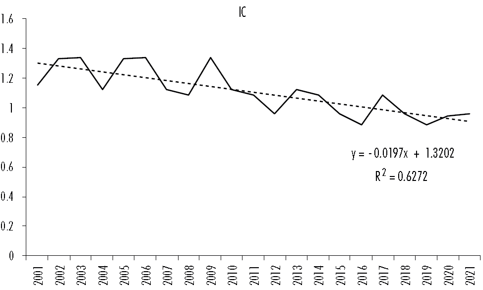 El propósito de este índice es comparar las tendencias de concentración o diversificación de exportaciones. Si este índice es mayor a 1, significa que la concentración de las exportaciones chinas hacia los países de la AP es mayor que la de los países de la AP hacia China. Si este índice es menor a 1, significa que la concentración de las exportaciones chinas hacia los países de la AP es menor que la de los países de la AP hacia China. Un aspecto clave de este índice radica en si a lo largo del tiempo se acerca o no a 1. Si lo hace, indica que los países tienden a tener un nivel similar de diversificación de exportaciones. Si no, alguna de las partes mejora, y la otra empeora en cuanto a diversificación.