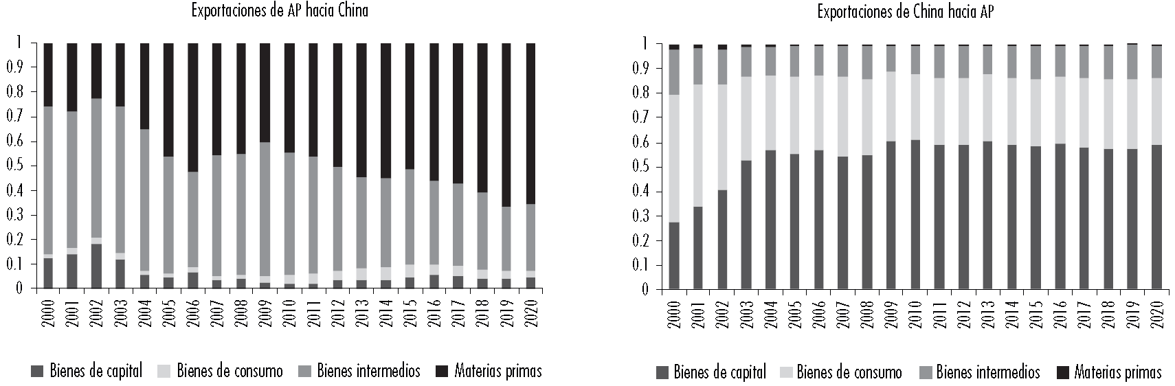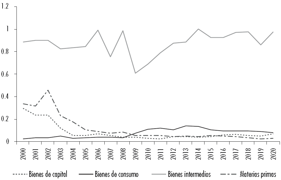 Adicionalmente, si se considera la composición de las exportaciones por etapa de procesamiento de los países de la AP hacia China, se encuentra que en el periodo que va del 2000 al 2020,1 se registra una acentuada y permanente tendencia hacia la reprimarización (véase Figura 5), pues la participación de las exportaciones de materias primas desde la AP a China aumenta continuamente.