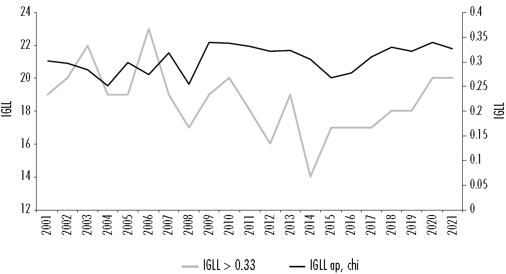 Al calcular el IGLL agregado para los países de la AP respecto a China se encuentra que la tendencia es ligeramente favorable hacia el comercio intraindustrial (línea oscura en la Figura 7). Para una conclusión más clara, se calcula el número de capítulos del SA en los que el IGLL es mayor a 0.33, es decir, los capítulos en los que se afirma que predomina el comercio intraindustrial (Durán y Álvarez, 2011). Así se puede caracterizar la evolución del comercio intraindustrial e interindustrial. La línea clara representa este cálculo y muestra una tendencia irregular entre 2001 y 2014 donde disminuye el número de capítulos, posteriormente se evidencia un aumento. Esta tendencia muestra que las dos partes analizadas incrementaron su especialización en sectores similares, lo que se asocia a una mayor integración en cadenas de suministro. El cambio de tendencia después de 2014 puede deberse a la caída en los precios del petróleo, que implicó un profundo reposicionamiento de la estructura exportadora de varios países del mundo (Gevorkyan y Semmler, 2016; Djimeu y Omgba, 2019).