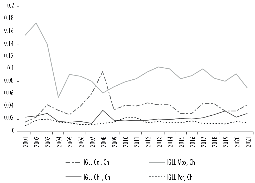 Si bien la literatura especializada señala diferentes formas de medir y explicar el comercio intra e interindustrial, una de las formas más utilizadas es el IGLL (Deese, 2017; Bano, 2014; Reinoso, 1997; Din et al., 2009; Bolinaga y Slipak, 2015). Este índice es considerado como la herramienta estándar para el comercio intra e interindustrial porque permite medir con simplicidad y comparabilidad temporal este tipo de intercambios (Grubel, 1970; Jaime Camacho y Cuevas Ahumada, 2020).
