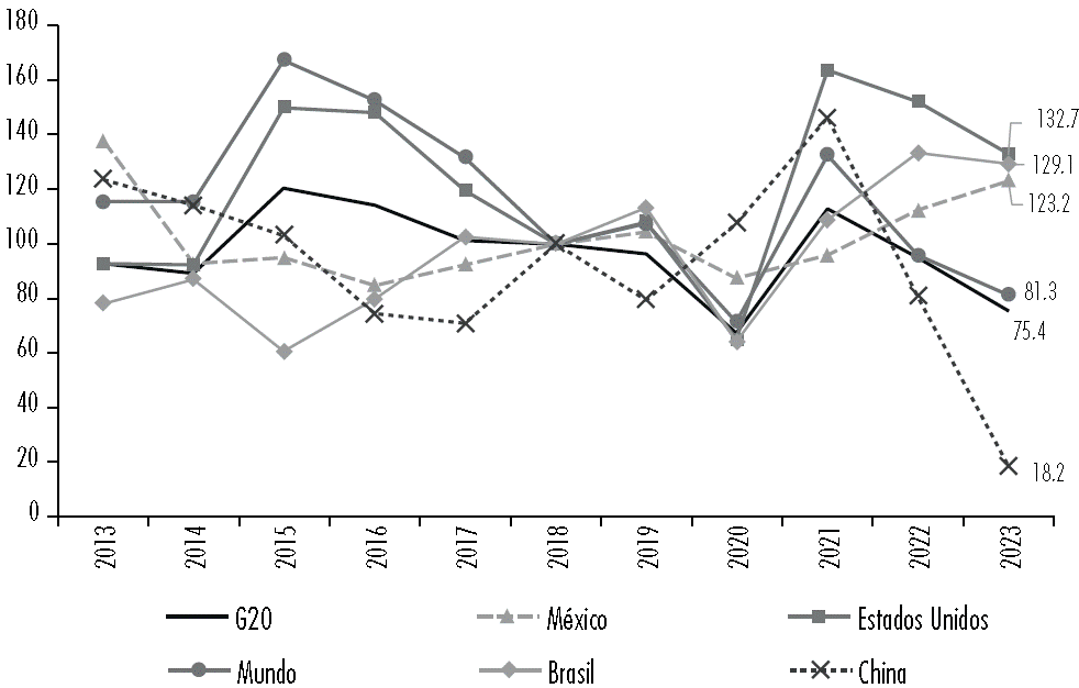 Como se señaló, el nearshoring se originó por un conjunto de eventos internacionales que le dieron a México ventajas comparativas en el comercio con Estados Unidos. En la Figura 1 se observa que, a partir del 2020, la IED en México creció a una velocidad mayor que el resto del mundo y de los países que conforman el grupo G-20. En 2023 la variación anual de de IED en México fue de 9.8%, mientras que en el mundo, en el G-20 y China, la tendencia fue a la baja y con caídas anuales de 15.0, 20.7 y 77.5%, respectivamente. Esta última caída en China refleja los efectos de la guerra comercial, ya que pasó del tercer lugar en 2013 como receptor de IED al décimo en 2023, periodo en que la inversión disminuyó 85.3%. En 2013 México ocupó el octavo lugar como receptor de flujos de IED (entre los países que conforman el G-20) y en 2023 pasó a ocupar el séptimo lugar. Ello implicó que en este último año México recibiera el 4.7% de la IED destinada a estos países. Si bien el flujo de la IED hacia México disminuyó 10.5% en este mismo periodo, se debió al estancamiento observado entre 2015 y 2019, así como al efecto provocado por la contingencia sanitaria en 2020. Sin embargo, a partir de 2021, la tendencia de crecimiento fue positiva.