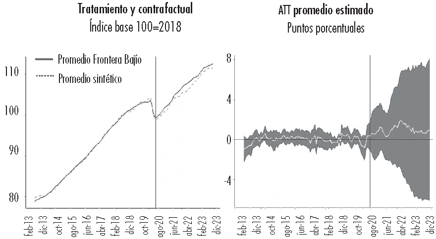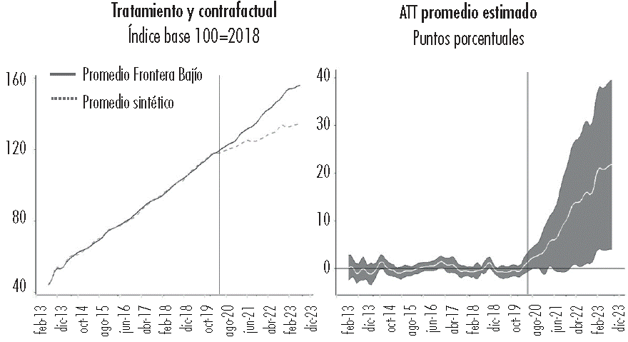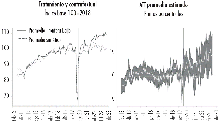 A partir de dichos modelos se identificó que en la producción industrial manufacturera la diferencia promedio entre las entidades tratadas y el contrafactual fue de 5.19 pp y para las nuevas inversiones y reinversiones fue de 11.36 pp. En el caso particular de las nuevas inversiones y reinversiones, se observa que la diferencia ha incrementado en el tiempo, esto podría prolongarse debido a la paulatina realización de los anuncios de IED hechos particularmente en las entidades fronterizas con Estados Unidos, como Pacific Limited (USD$14 billones) y Lingong Machinery Group (USD$5 billones), proyectos que iniciaron su desarrollo en 2024.