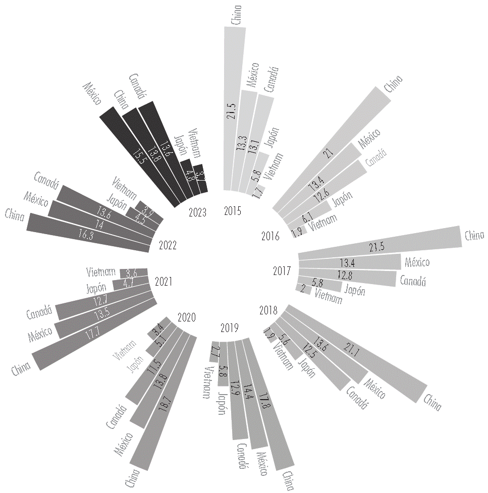 El conflicto comercial entre Estados Unidos y China, así como la firma del tratado del T-MEC, coincidieron con el aumento en la participación de las importaciones realizadas por Estados Unidos procedentes de México. Entre 2015 y 2017 las importaciones de Estados Unidos provenientes de China, México y Canadá representaron 47.6% del total (véase Figura 2). China ocupó el primer lugar al representar 21.5%, mientras que México ocupó el segundo lugar con 13.3% de las importaciones. Durante 2023, las importaciones de Estados Unidos provenientes de China, México y Canadá representaron el 42.9% del total y México desplazó a China en el primer lugar, con una representación del 15.5% de las importaciones totales y con una tendencia creciente. En segundo lugar, China pasó a representar 13.8% con una tendencia decreciente en su participación.