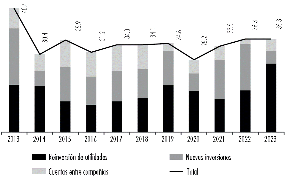En el mismo sentido, al analizar el comportamiento de la IED en México, se observó que entre 2015 y 2019 decreció a un ritmo promedio del -0.7%, mientras que entre 2021 y 2023 creció a un promedio de 2.8%. Al desglosar las inversiones por tipo (véase Figura 3), se encontró que las reinversiones, en promedio crecieron, 10.4% anual entre 2015 y 2019, y entre 2021 y 2023 lo hicieron a una tasa anual promedio del 35.4%. Como resultado este componente representó en 2023 el 73.4% del total de la IED. Lo anterior refleja la intención de las empresas ya establecidas en México de continuar y expandir sus operaciones en el país.