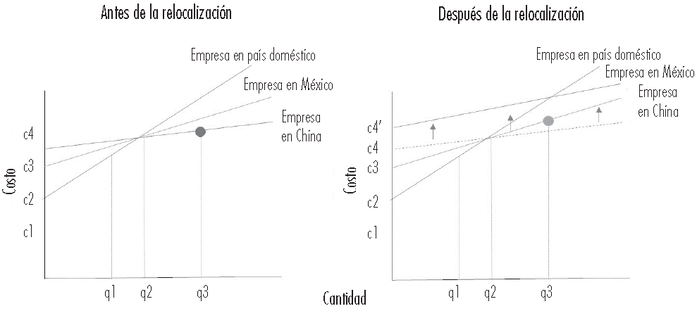 Siguiendo a Jones y Kierzkowski (1990), en el lado izquierdo de la Figura 4, se ilustran los costos a los que se enfrentaba una empresa antes de la reestructuración de las cadenas de valor al producir una cantidad: la producción en China resultaba ser la opción más eficiente, presentando costos más bajos en comparación con México y con las empresas en el país doméstico.4 Sin embargo, en el lado derecho de la Figura 4, los costos en China se incrementan debido a factores como el aumento en los costos laborales y la imposición de impuestos arancelarios por parte de Estados Unidos. Como consecuencia, este aumento en los costos reduce la eficiencia de producir en China, y se observa que la producción en México se vuelve más competitiva.