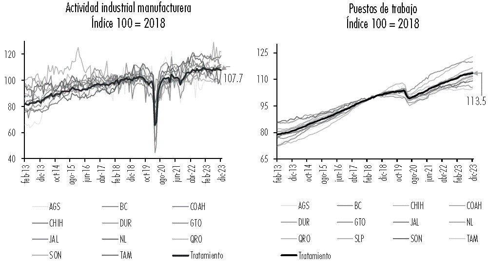 En resumen, para el grupo de tratamiento se eligieron los estados fronterizos y los del Bajío debido a la mayor integración que tienen con Estados Unidos. Para el grupo de control, se eligieron a los estados restantes, con excepción de Ciudad de México, Campeche y Tabasco. En total, el grupo de tratamiento estuvo integrado por 12 entidades federativas, mientras que el grupo de control por 19. Dada la estadística descriptiva presentada en esta parte del estudio, se puede observar que existe una diferencia entre los niveles observados en diciembre de 2023 para los grupos formados en todos los indicadores, lo que da indicio de que existe un efecto del nearshoring en México. En el mismo sentido, además de la guerra comercial entre Estados Unidos y China, y la problemática global en las cadenas de suministro debido a la dependencia de insumos provenientes de Asia, particularmente de China, en México también hubo políticas públicas que pudieron impactar ciertos sectores, como el mercado laboral. Un ejemplo es la reforma de subcontratación implementada en 2021, la cual prohíbe a las empresas subcontratar personal que realice actividades directamente relacionadas con su objeto comercial, así como el incremento en el salario mínimo, el cual subió en términos reales 12.8% entre 2019 y 2023.