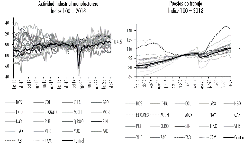 Para agrupar la actividad industrial manufacturera por entidades federativas fue necesario ponderar el índice por la participación de cada entidad en el PIB manufacturero total, considerando los datos del Producto Interno Bruto Estatal (PIBE) del 2018. A partir de este tratamiento de los datos, se observó que el comportamiento de la actividad industrial manufacturera en el grupo de tratamiento,9 tuvo trayectorias que presentaron una menor varianza respecto al grupo de control10 (véase Figura 5). Entre 2013 y 2019 el crecimiento promedio anual de este grupo fue de 2.9% y entre julio de 2020 y diciembre de 2023 fue de 5.3%. Respecto al indicador de los trabajadores registrados en el IMSS, el crecimiento promedio anual fue de 4.3% y entre julio de 2020 y diciembre de 2023 fue de 2.7%, no obstante, a partir de abril de 2021, comienza a registrar tasas de crecimiento positivas promedio de 4%.
